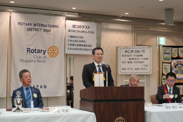 4月15日の例会では、岡山市議会議員 川本浩一郎様を卓話にお迎えいたしました。